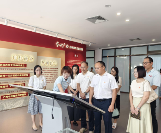 陈会方一行人首先来到当代广西杂志社一楼,通过多媒体智能展示屏听取负责人介绍《当代广西》刊网融合情况,随后前往杂志社二楼参观全媒体传播与服务中心,并在社史馆了解广西党刊的历史沿革和发展成就以及参观当代书院。