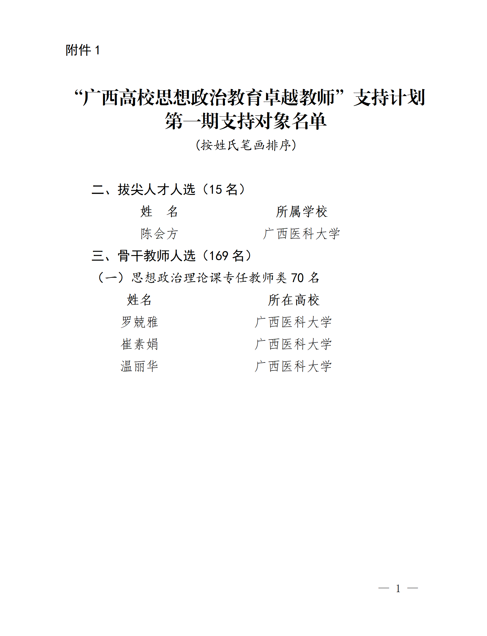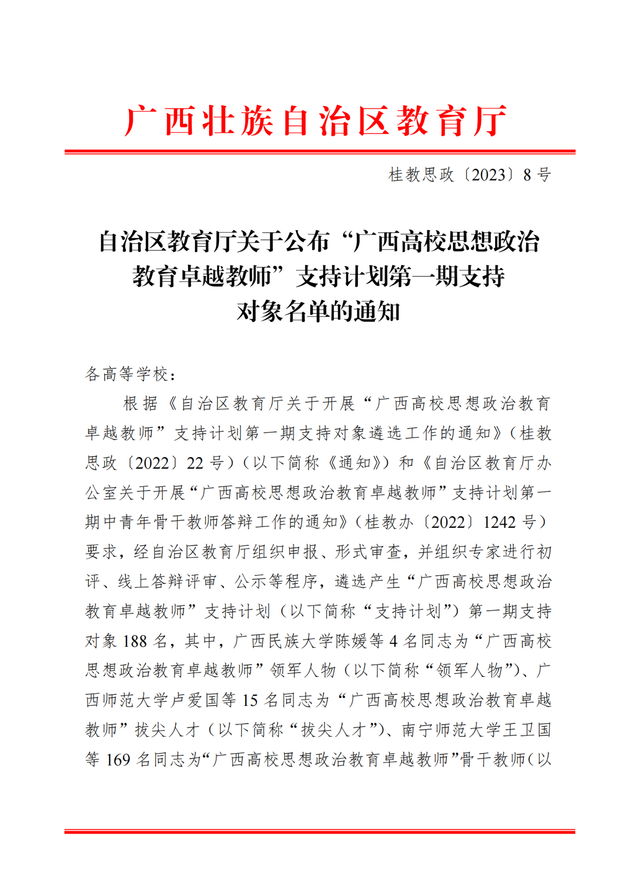 近日,自治区党委教育工委、自治区教育厅公布“广西高校思想政治教育卓越教师”支持计划第一期支持对象,公司英国威廉希尔公司共有4位教师入选,分别是:陈会方教授被认定为“广西高校思想政治教育卓越教师”拔尖人才,罗兢雅副教授、崔素娟副教授、温丽华副教授被认定为“广西高校思想政治教育卓越教师”骨干教师(专任教师)。