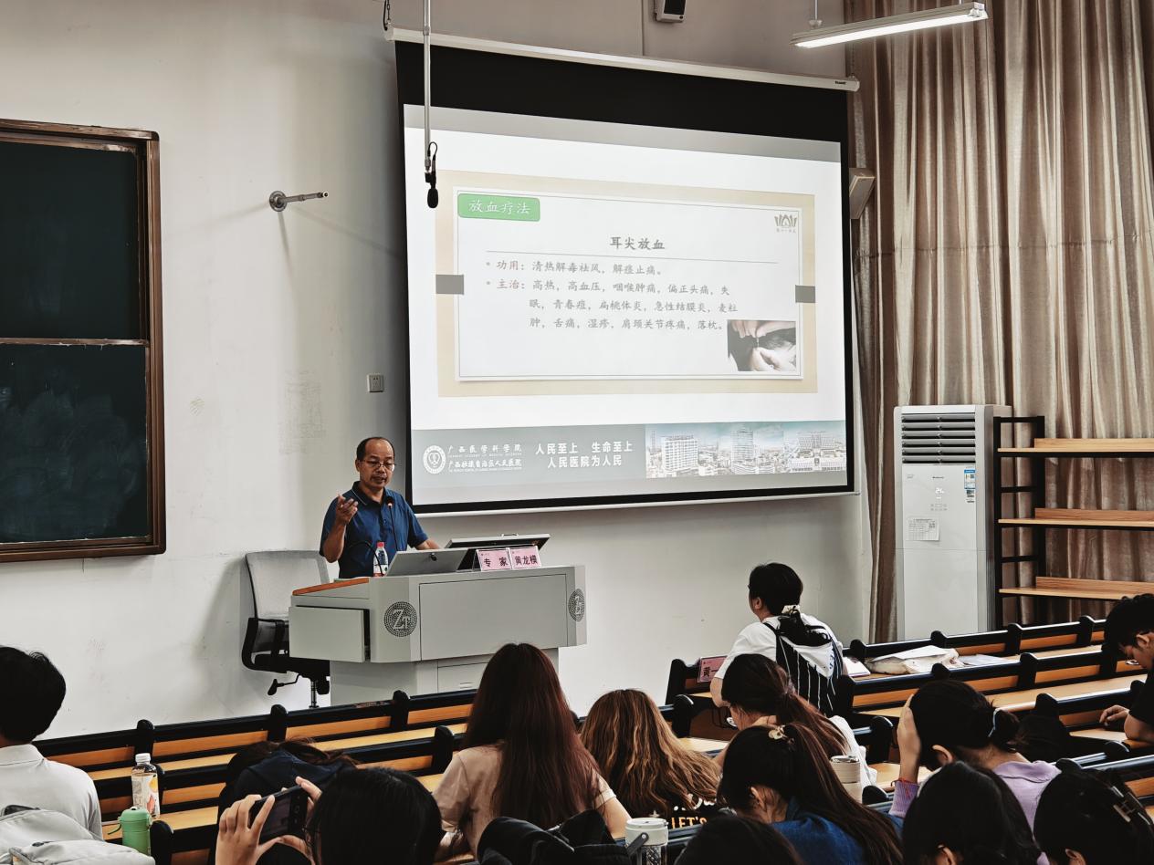 接着,黄医生逐一讲解内治、针刺、疗灸、罐痧等多种中医疗法的原理、功效及适应症,让同学们深刻感受到中医药在治疗各种疾病方面的独特优势及实用价值。