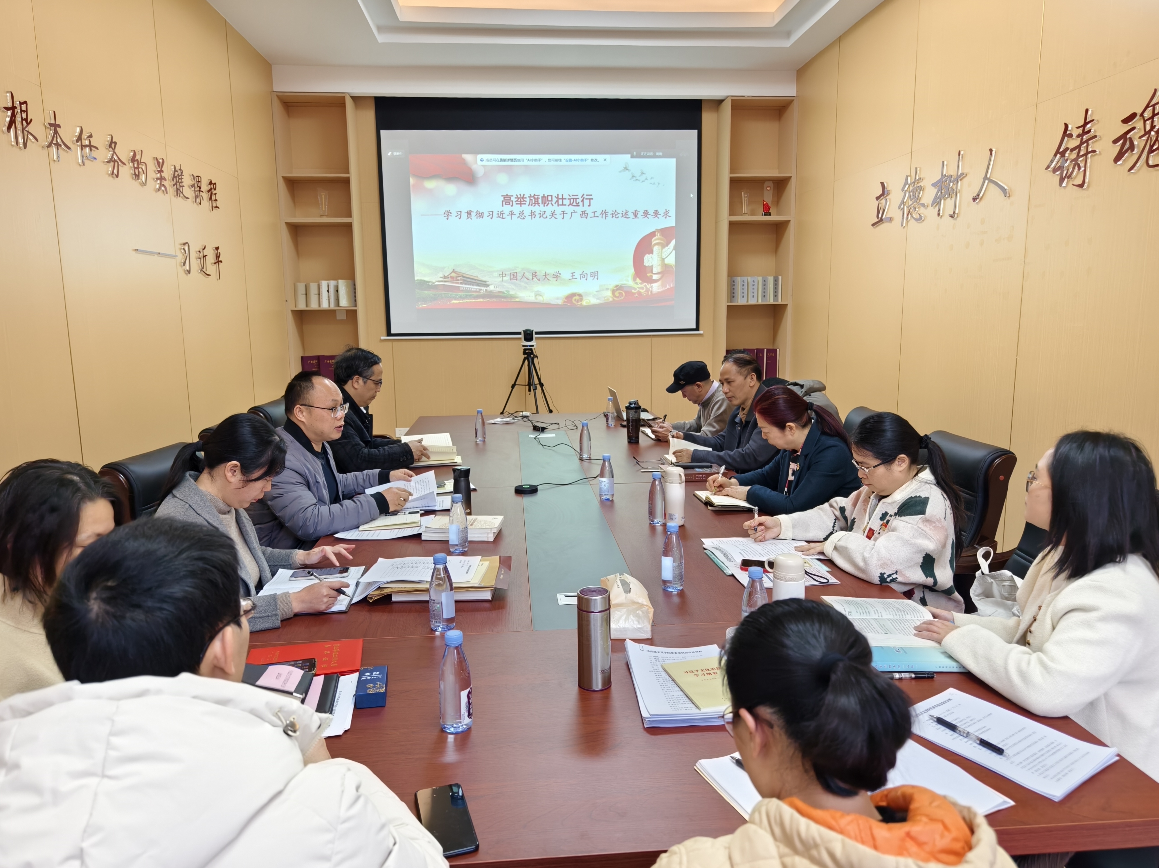 会上,王向明教授为与会人员作了《高举旗帜壮远行——学习贯彻习近平总书记关于广西工作论述的重要要求》的专题辅导。王向明教授以视频《壮美之路》为切入点,阐释了广西是“一带一路”有机衔接的重要门户、要做“高质量发展”的排头兵、要保护好生态环境、要做民族团结示范区、要以改革创新推动教育发展等方面的内容,对公司进一步提高医公司校英国威廉希尔公司高质量发展,主动融入服务“一区两地一园一通道”建设提供了建设性指导。